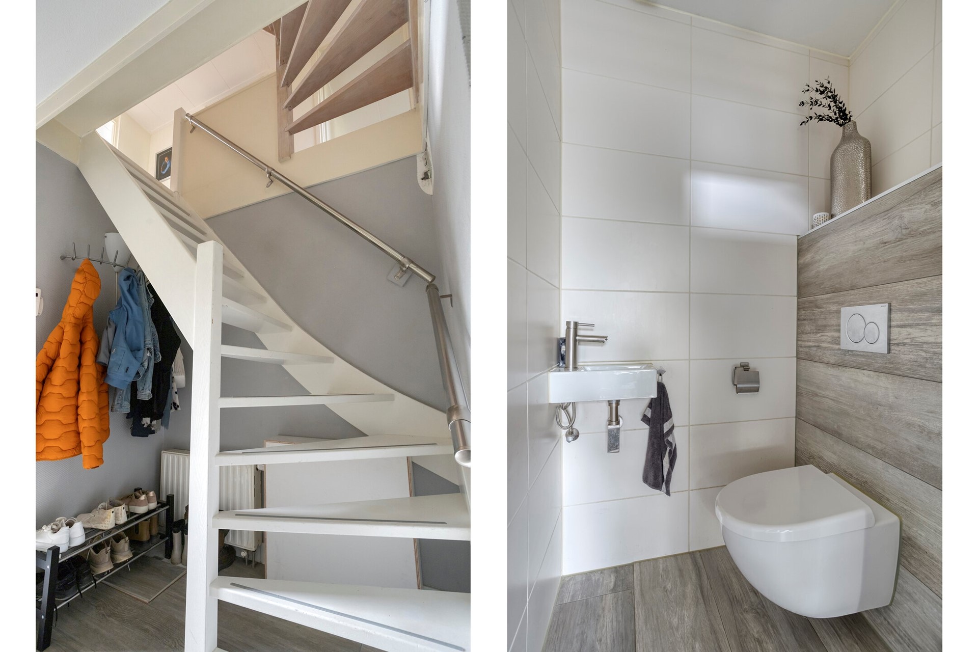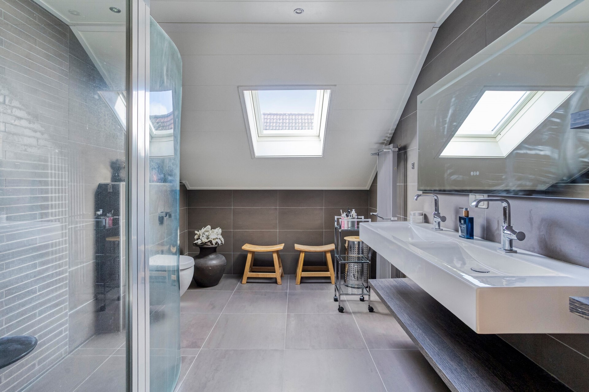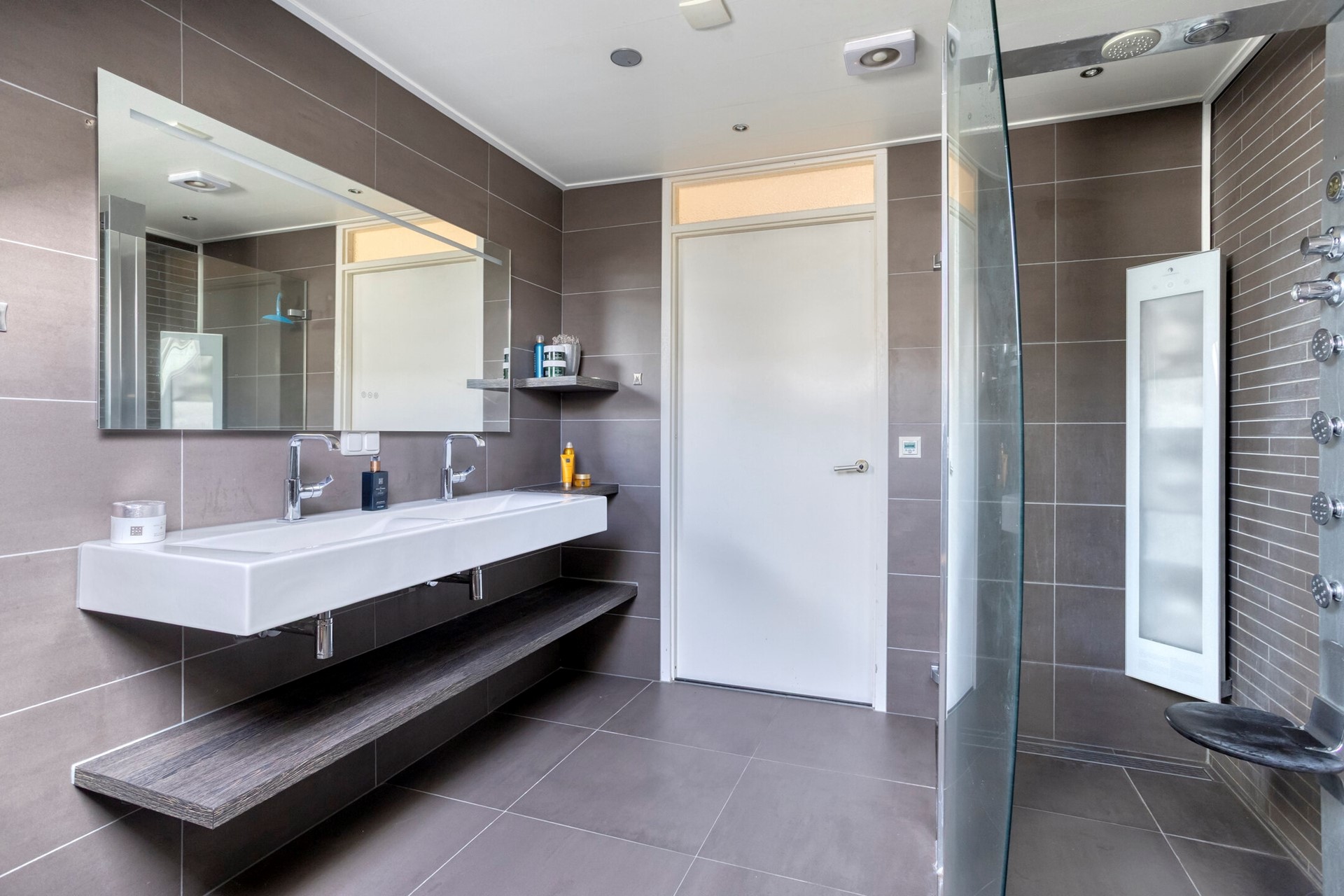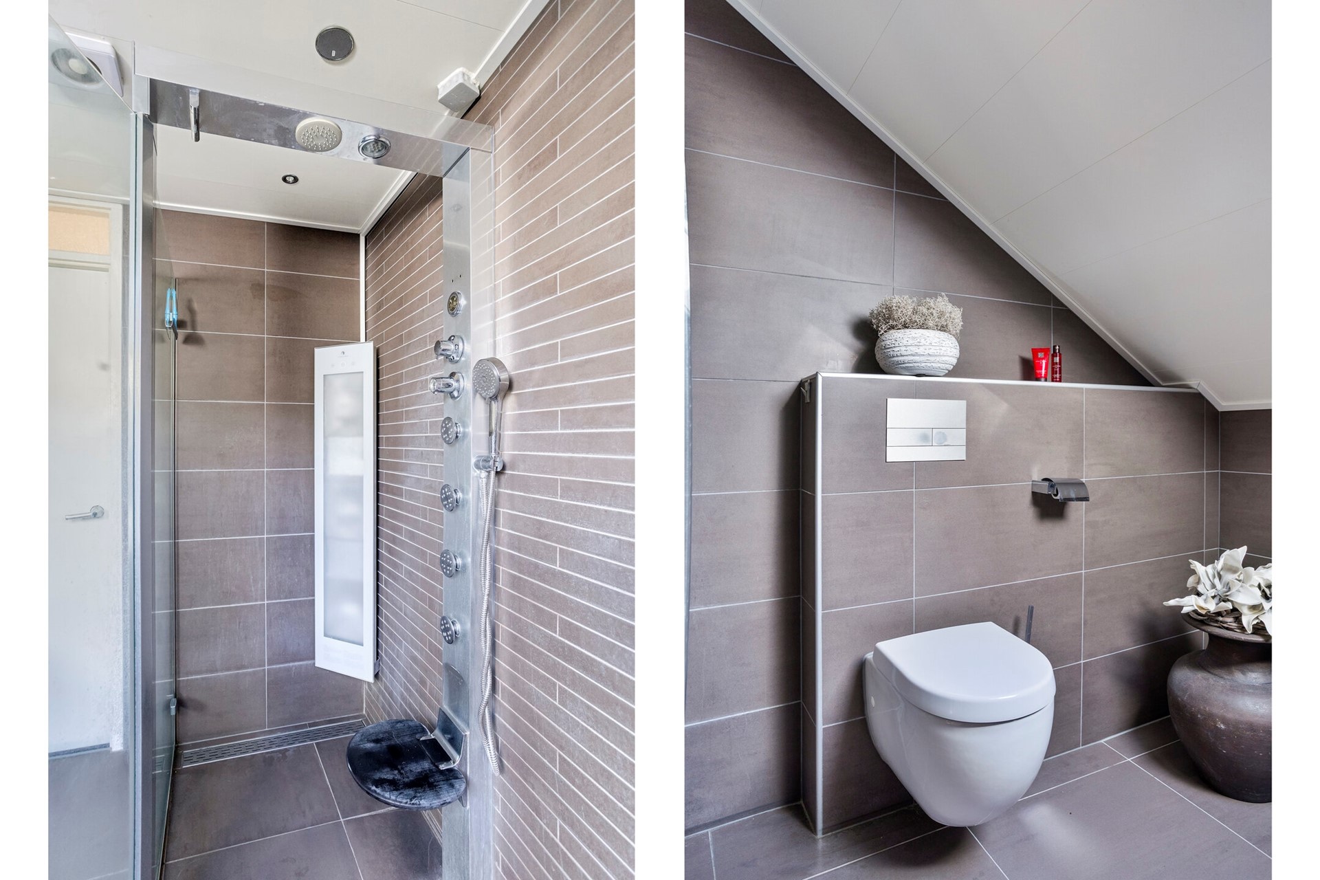 Eerste verdieping: Terug bij de entree gaan we met de trap naar de eerste verdieping. Op de ruim opgezette overloop zien we vijf deuren. De eerste drie deuren leiden naar ruime slaapkamers, door de vierde deur kom je in het voorportaal van de vierde slaapkamer welke beide zijn voorzien van ingebouwde kast/opslag ruimte. Via de laatste deur komen we in de badkamer. De moderne badkamer is van alle gemakken voorzien en uitgerust met luxe opties als een douche met massagefunctie en sunshower, dubbele wastafel met hierboven een anticondensspiegel met verlichting, vloerverwarming, hangend toilet, designradiator en een prettige lichtinval door het kiepraam.