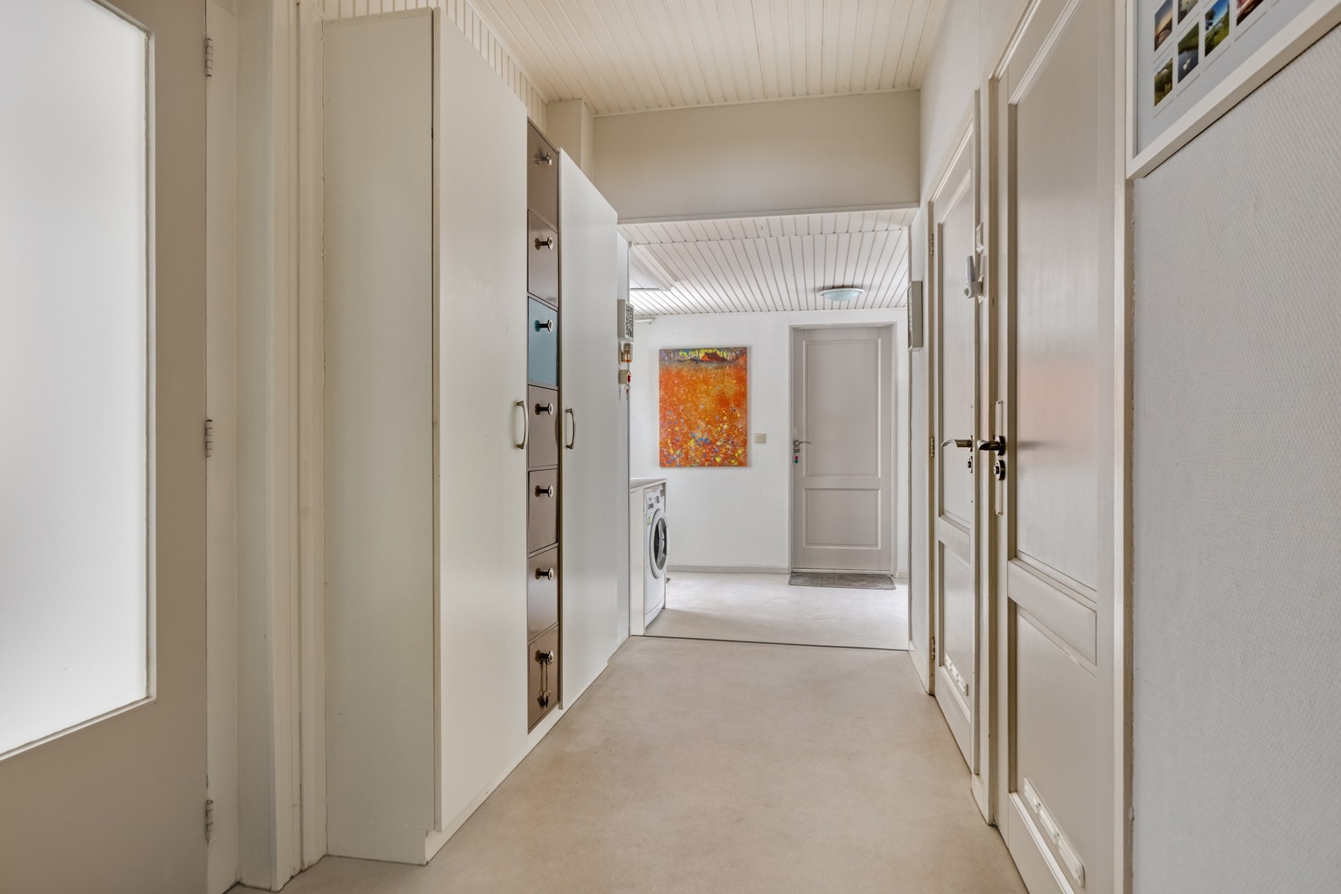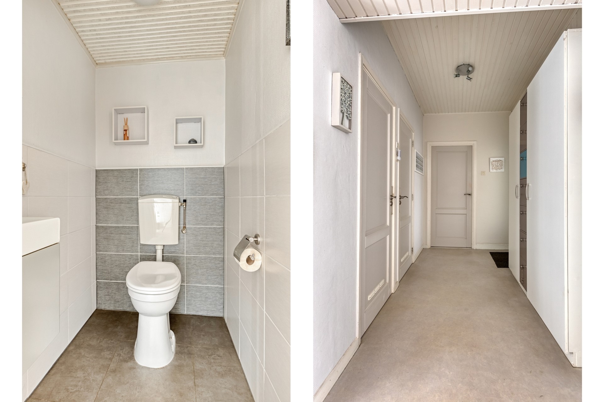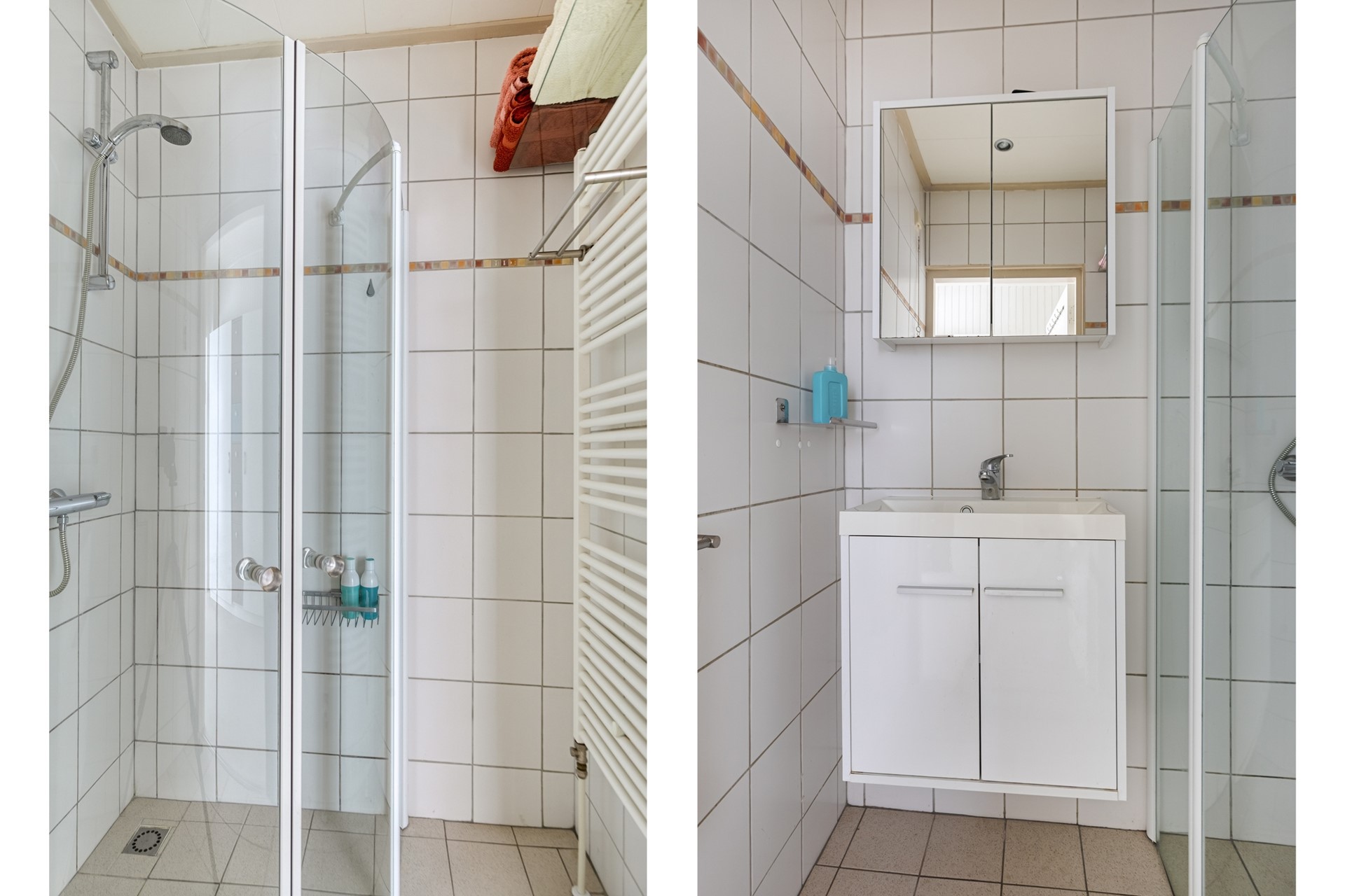 Terug door de woonkamer bereiken we de bijkeuken/hal die ons brengt bij de slaapkamer (20,9m2) op de begane grond. De combinatie met de badkamer (2006) die aan de andere kant van de hal is, maakt deze woning geschikt voor toekomstbestendig wonen. In deze hal treft u eveneens het toilet. We lopen door naar het einde van de gang. Hier treffen we de nieuwe CV ketel (2025) aan, een uitgang naar de achtertuin en de doorgang naar de aangebouwde (1979) stenen garage (28m2) die volledig is onderkelderd (24m2) en voorzien van een zolder die met vlizotrap bereikbaar is.