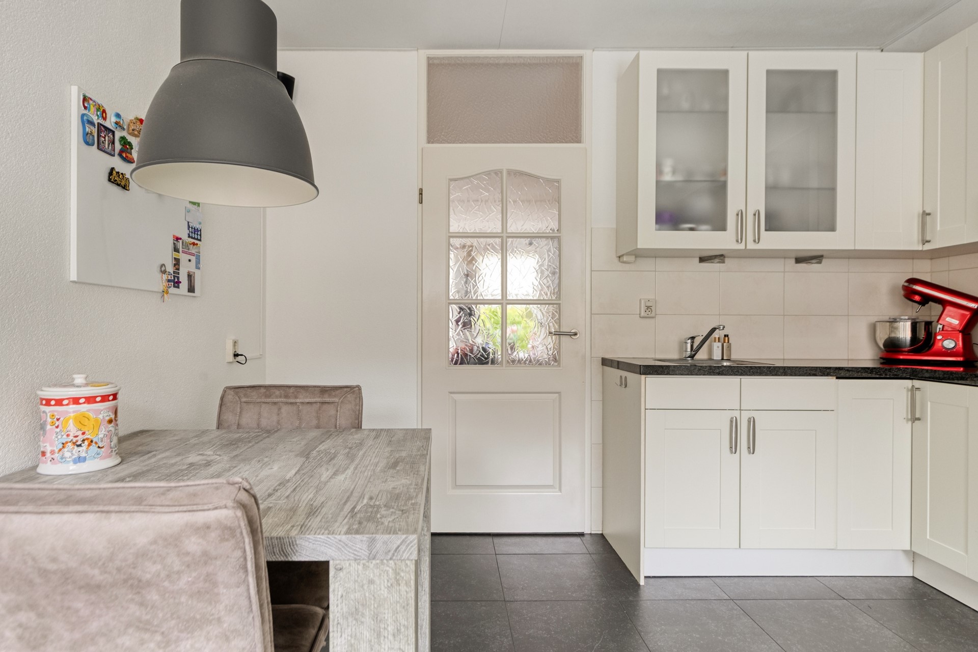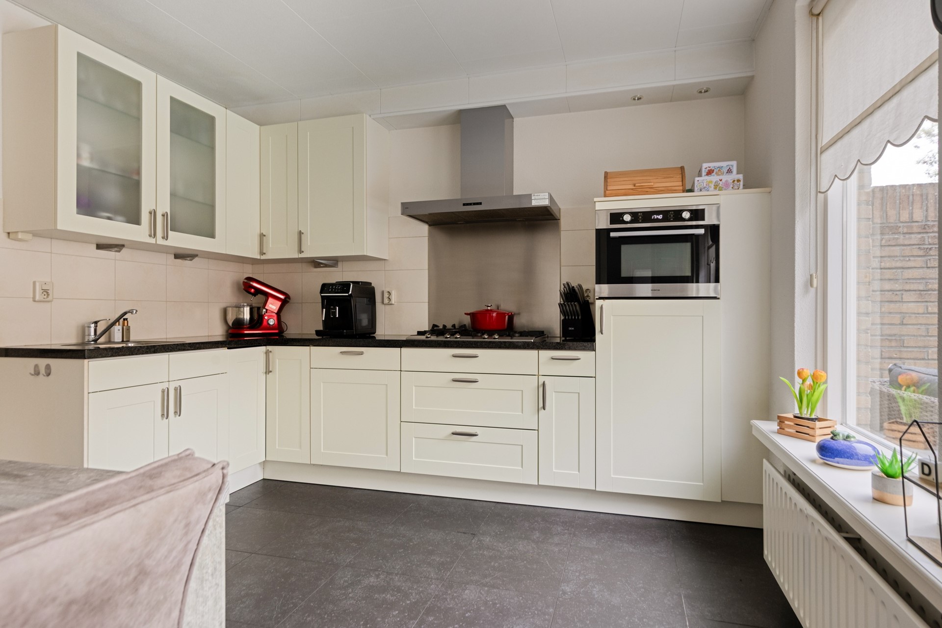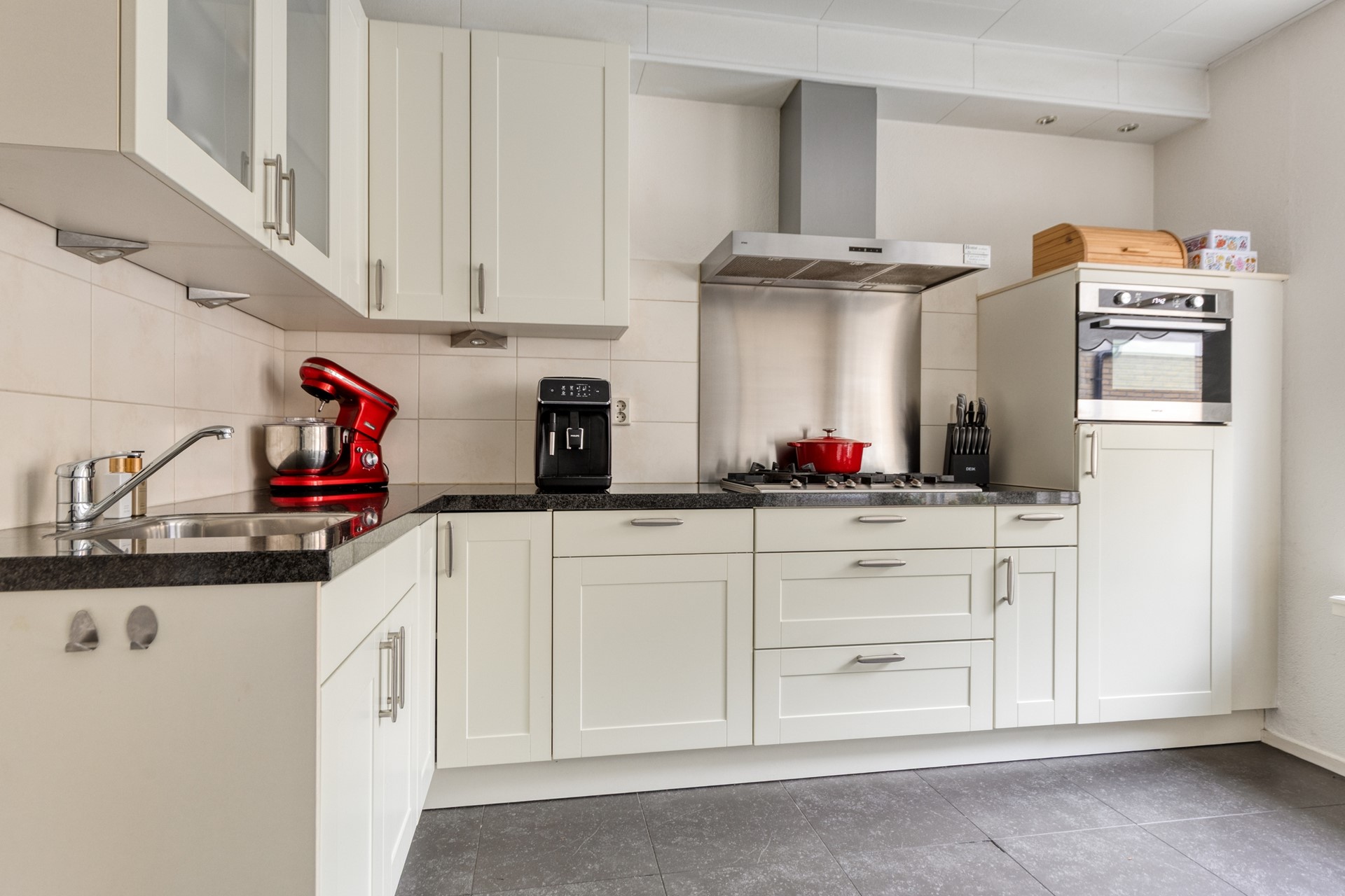 De gesloten keuken is voorzien van een strakke plavuizenvloer. De inbouwapparatuur is al eens vernieuwd en het granieten keukenblad is tijdloos. Het voordeel van een gesloten keuken is dat het de geurtjes uit de woonkamer houd en jouw visite de voorbereidingen van jouw kookkunsten niet kan zien.